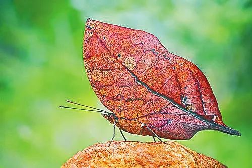 与此同时,海南热带山地雨林中也分布着“中国蝶王”:裳凤蝶和金裳凤蝶。这两种形态相似的蝴蝶是我国蝶类中体形最大的种类。飞行时,后翅黑黄相接的部分金光四逸,绚丽夺目,具有极高的观赏价值。