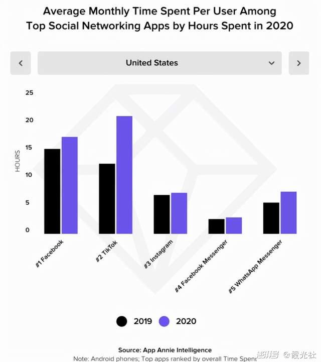2020年,疫情下的居家隔离加速了社交媒体的发展。Datareportal的一份报告显示,去年全球社交媒体用户数增加13%以上,平均每天有超过130万新用户加入社交媒体平台,TikTok的优势地位也随之进一步巩固。据APP Annie数据,去年TikTok用户使用时长同比增加325%,增速远超Facebook、Instagram和WhatsApp等应用。