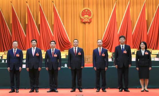新当选的贺州市五届人大常委会主任、副主任、秘书长合影。