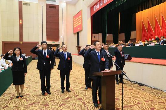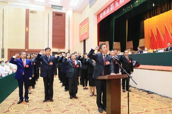 出席市五届人大一次会议第三次全体会议的代表见证了宣誓。