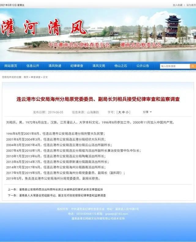 2019年6月5日,灌南县纪委监委发布一则“审查调查”通报显示,连云港市公安局海州分局原党委委员、副局长刘相兵接受纪律审查和监察调查。这份通报中,刘相兵的简历显示,2014年7月至2017年9月,他任连云港市公安局海州分局路南派出所所长,与“刘某乙”的职务重合。
