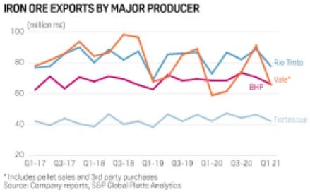 四大寡头出口铁矿石发运量的演变 (2017-2021一季度)铁矿石寡头们持有大量未开发的低成本铁矿石产能。面对上涨的铁矿石价格,他们各有各的盘算。