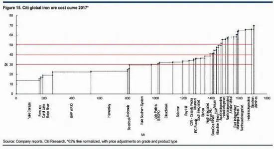 铁矿石成本曲线示例,图片来源:citi research铁矿石的到岸成本是由可采储量、矿种、矿石平均品位及地理位置等诸多因素共同决定的,除非有技术上的创新要大幅降低它们的成本并非易事。投资建设更多不受铁矿石寡头控制的低成本铁矿石产能,同样能将高成本产能釜底抽薪式地挤出市场。这里的低成本铁矿石产能是指成本位于全部成本中位数以下的产能。