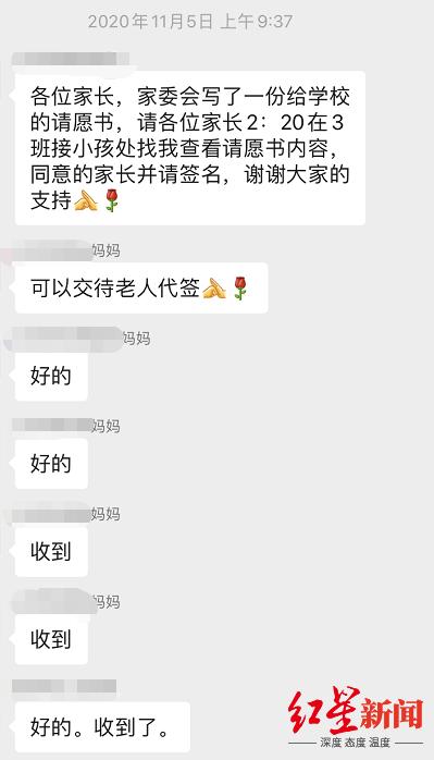 梳理来看,班上家长共两次联名提交《请愿书》,一次是在去年11月,此前因妞妞作业没写完被翟老师喊到办公室罚写,回家后妞妞哮喘发作,双方发生争吵,而后家委会避开妞妞父母单独建群并呼吁家长在请愿书上签名,要求妞妞转学,有37名家长签字;另一次是今年3月,妞妈发现孩子抗拒上学,送去学校后感到不安,入校遭拒后她强行翻越校门接走孩子,家委会再次写了《请愿书》要求加强管理,同时对扰乱学校秩序的行为进行处理。