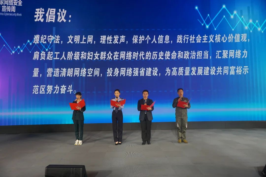 网络安全为人民,网络安全靠人民。10月17日,浙江省网络安全宣传周个人信息保护日活动在湖州城市大脑举行,活动以妇女群众和广大职工喜闻乐见的网络安全歌曲演唱、网络安全小品演出等形式宣传了网络安全知识,视频连线正在开展网络安全宣传的社区与企业分会场,妇女代表与职工代表宣读了网络安全倡议书。