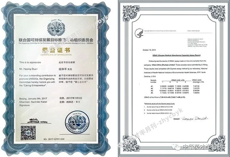 左:维兰尼产品荣获联合国可持续发展目标推进行动组织委员会证书右:美国国立卫生研究院(NIH)对维兰尼产品抗氧化能力(ORAC)的认证