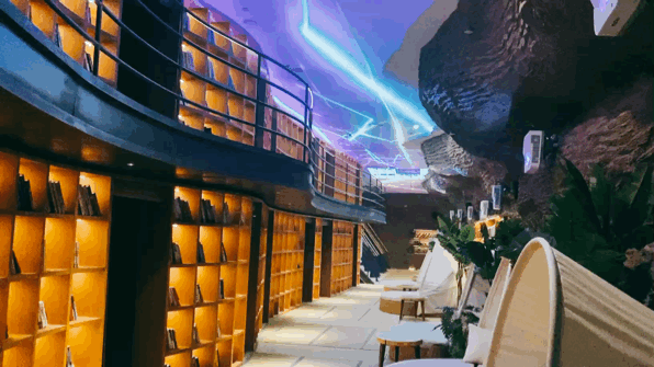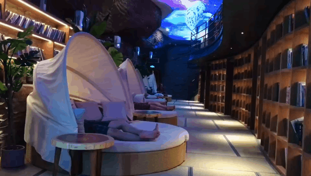 电玩游戏区、洞穴区...各种极具特色的休息室是这里最大的亮点,尤其“人气王”书吧休息区,躺在柔软的床上,抬头就能看到海底世界的奇观,想想就觉得美妙舒坦极了~