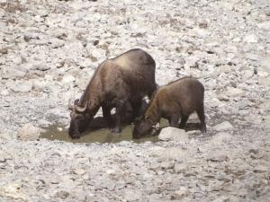 两只高黎贡羚牛在硝塘饮水。蒋朝晖 摄珍稀