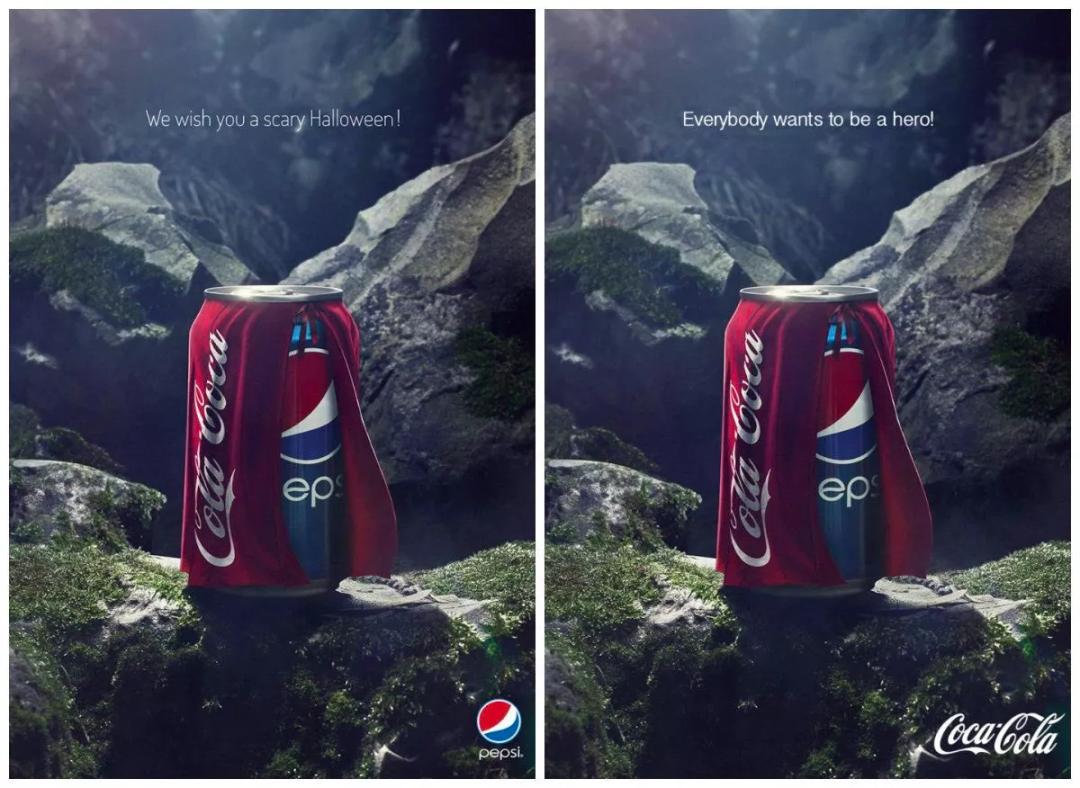在万圣节当天,百事可乐给自己的对手送上了“真挚”的祝福:祝你有个恐怖的万圣节,暗讽可口可乐是妖魔鬼怪。可口可乐不甘示弱,反手用原图回击:每个平凡人都渴望成为英雄,说明百事可乐披上超人斗篷妄想成为像可口可乐一样的英雄。