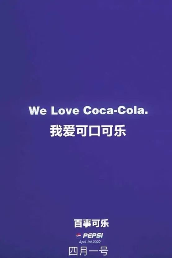 2000年4月1日,百事可乐破天荒向自己的死对头表白“我爱可口可乐”。人们在诧异之余才恍然大悟,哦,原来今天是愚人节。可口可乐与百事可乐既相互拉踩也相互成全,通过一波波的反向营销为彼此赚足了噱头。