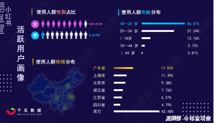 从年轻化的角度来看,小红书用户画像中,用户年龄多集中在18-34岁这一阶段, 90后用户占比高达70%,这其中又有50%是“95后”的“Z世代”用户;从女性化的角度来看,则是小红书用户画像中女性占比高达88.37%,男性占比11.61%;使用人群地域分布占比前三为广东省、上海市、北京市,超过56%的用户来自北上广深四大一线城市。