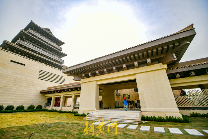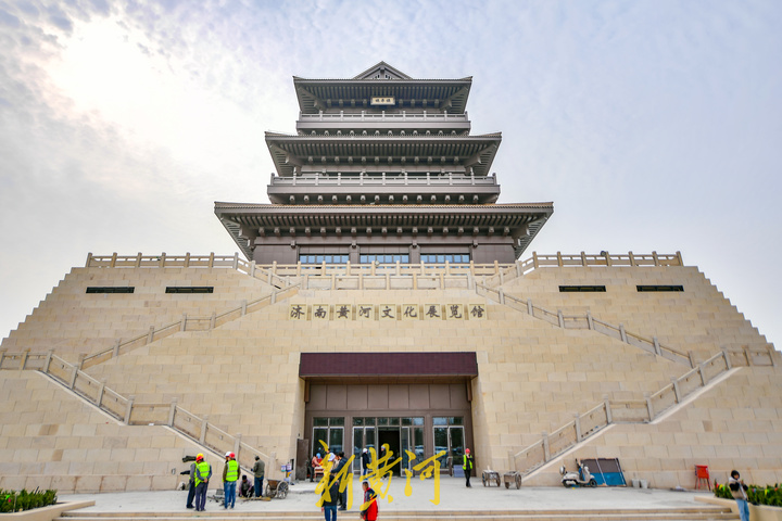 在底座外墙上已经悬挂上“济南黄河文化展览馆”的字牌,仿古楼阁顶层的屋檐下悬挂上了“鹊华楼”的牌匾。