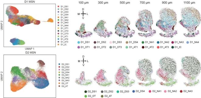 研究人员首先对成年小鼠的伏隔核区域进行了单细胞测序分析,区分出D1 MSN、D2 MSN、中间神经元等主要细胞类型。在此基础上,进一步对以上三群神经元进行详细分类 (图1),鉴定出8个D1 MSN亚类 (可进一步细分为30个亚类)、8个D2 MSN亚类 (可进一步细分为27个亚类) 和13个中间神经元亚类。结合荧光原位杂交并参考Allen Brain Atlas中的原位杂交数据,研究者们发现富集在不同神经元亚类中的基因呈现出不同的空间分布特征,提示这些神经元亚类的基因表达与其空间分布相关,这可能是伏隔核结构/功能复杂性的细胞基础。