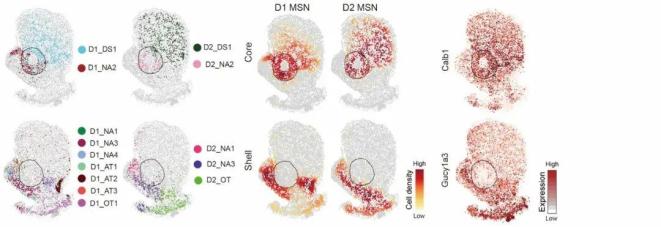 图2. 根据MERFISH数据划分的MSN亚类及它们在纹状体中的分布在根据MERFISH数据划分MSN亚类后,研究人员进一步分析了不同MSN亚类的空间分布特征,发现这些特征与已知的纹状体结构复杂性高度相关,且在伏隔核内发现了之前未被报道的结构异质性 (图2)。例如,依据MSN亚类间的临近位置关系进行聚类,可将其分为若干大群,对应于纹状体内的主要分区。而根据伏隔核内不同MSN亚类的空间分布,可将其大致分为前部 (anterior part) 和后部的核 (core) 及壳 (shell) 区域。尽管伏隔核的核/壳结构被广泛接受,但之前的研究无法准确定义核/壳区域,仅根据大致的解剖学结构对其加以区分。本研究发现不同的MSN亚类高度富集于核或壳区域,提示这可能是区分核/壳的细胞学基础 (图3)。有趣的是,在核或壳区域内部,不同的MSN亚类仍表现出广泛的空间分布异质性。例如,在内侧壳 (medial shell) 区域,多个MSN亚类沿背腹轴分布,而在核区域,不同MSN亚类偏向于腹内侧或背外侧 (ventromedial/dorsolateral)。以上结果表明,不同MSN的空间分布特征可能是纹状体和伏隔核结构复杂性的细胞学基础。那么,不同的MSN亚类是否与伏隔核的功能多样性存在关系呢?研究者们从以下三方面进行了分析:首先,不同MSN亚类的空间分布特征,与已知的伏隔核亚区域功能多样性相吻合;第二,与神经系统功能相关的基因 (如阿片受体),表现出高度的细胞和空间分布特异性;第三,不同神经元亚类的基因表达与空间分布特征提示在伏隔核内存在细胞类型依赖和亚区域特异的细胞间相互作用。以上发现表明,伏隔核内不同神经元亚类的基因表达和空间分布特征至少部分构成了这一区域功能复杂性的细胞和分子机制。