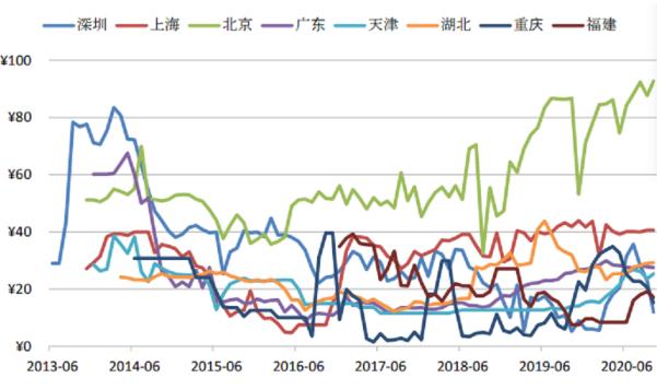 根据Refinitiv统计,2020年,全球碳市场规模增长20%,市场规模已经达到2720亿美元。碳市场作为温室气体重要减排工具作用日益增强。截至2020年,全球碳市场的覆盖范围包括一个超国家碳市场(欧盟)、八个国家碳市场和二十四个地区碳市场(icap)。碳市场覆盖的碳排放量已经占到全球总碳排放量的14%(IIGF),碳市场覆盖地区的人口约占全球人口总数的八分之一,碳市场覆盖地区GDP产值占全球GDP的37%。由此可见,碳市场直接影响到实现“巴黎气候协定”碳减排的目标。