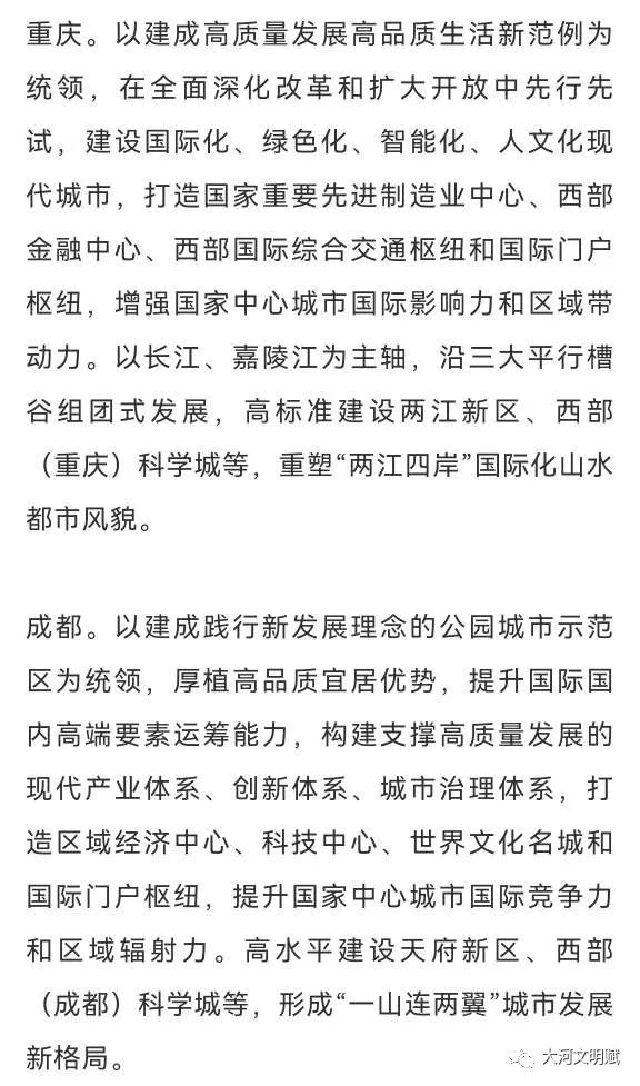 此处对重庆要求明确,即“四化”现代城市:国际化(两江四岸)、绿色化(广阳湾)、智能化(两江新区)、人文化(长江艺术湾区);成都强调以构建现代产业、创新、城市治理三大体系来支撑高质量发展,落脚点为“双高”中的高质量发展。
