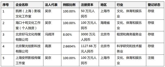 继续往下看,吴京的对外投资,主要有北京好马文化传媒有限公司和北京聚光绘影科技有限公司。