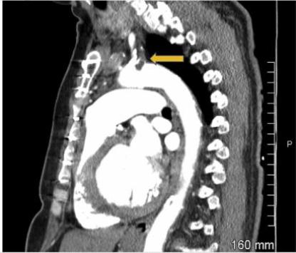 入院查体:体温 37.4℃,心率 110次/分,呼吸 18次/分,血氧饱和度 95%。左上肢收缩压 69mmHg,右上肢收缩压 112mmHg,双肺底可闻及少量湿啰音,心脏听诊律齐,各瓣膜听诊区未闻及杂音,无心包摩擦音。颈静脉无扩张,双下肢无水肿,同时发现,与右上肢相比,左上肢的皮温更低,脉搏同样也更弱。