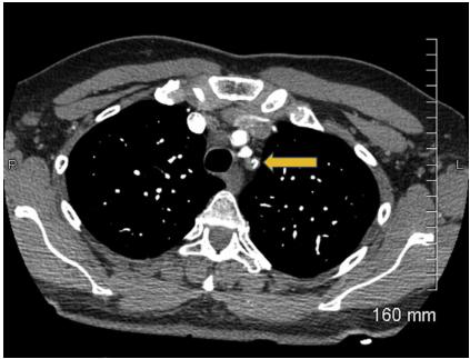 图1 入院心电图肌钙蛋白水平轻度升高,为0.7ng/ml,初步诊断为非ST段抬高型心肌梗死,遂予静脉输注普通肝素抗凝治疗。行胸部增强CT显示左锁骨下动脉近端血栓形成并延伸至主动脉弓(图2),并未看到左内乳动脉至左前降支移植物的图像。