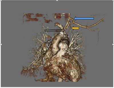 图4 术后复查心电图术后第二天行超声心动图显示左心室射血分数降低至20%,2个月后恢复到基线水平。出院后1个月行胸部CT三维重建(图5)显示左侧颈动脉至左锁骨下动脉旁路移植术、左内乳动脉至左前降支移植物及锁骨下动脉远端通畅。