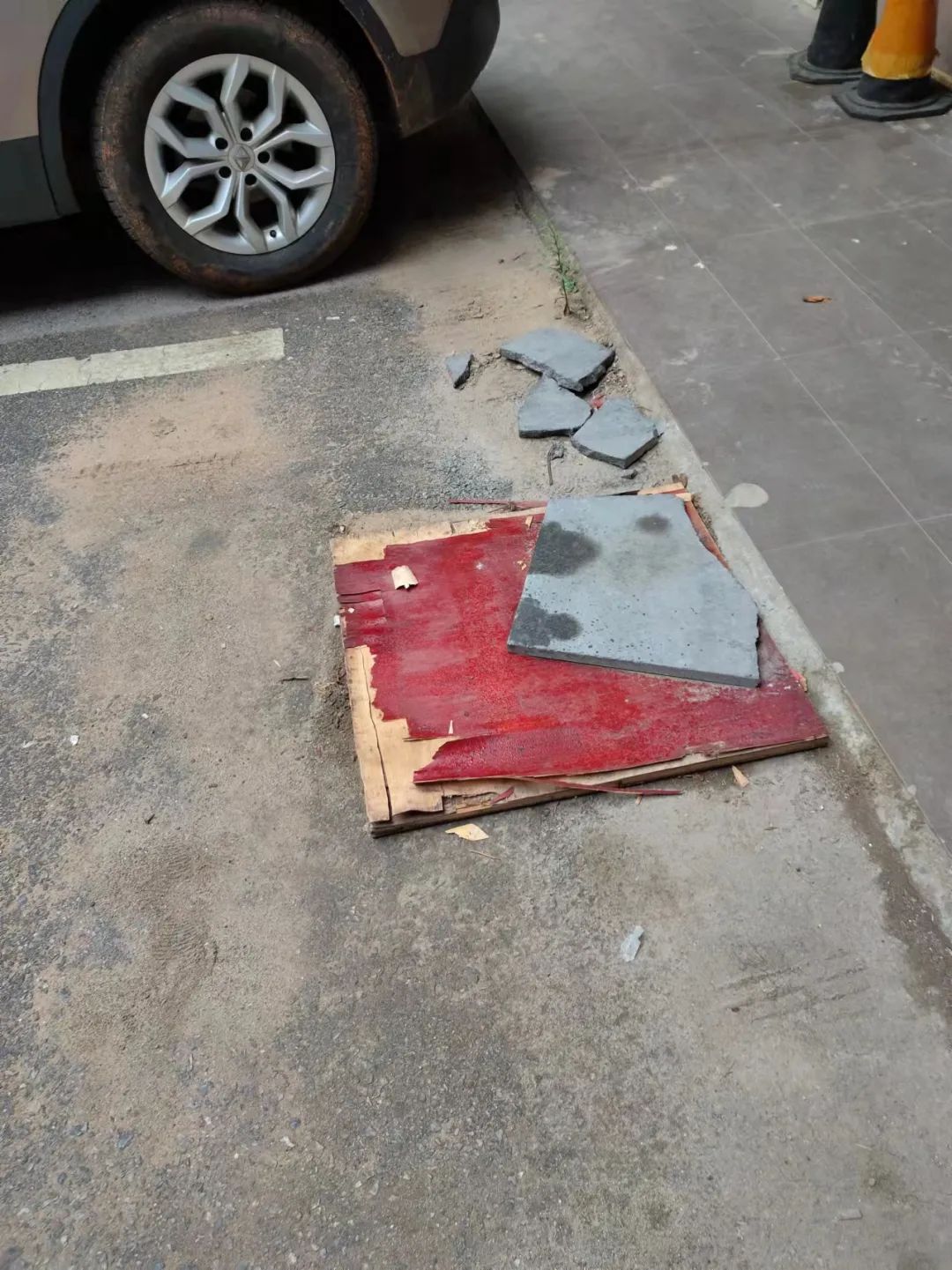 存在问题:(1)停车场杂物乱堆乱放;(2)下水道井盖破损;(3)车辆乱停乱放。