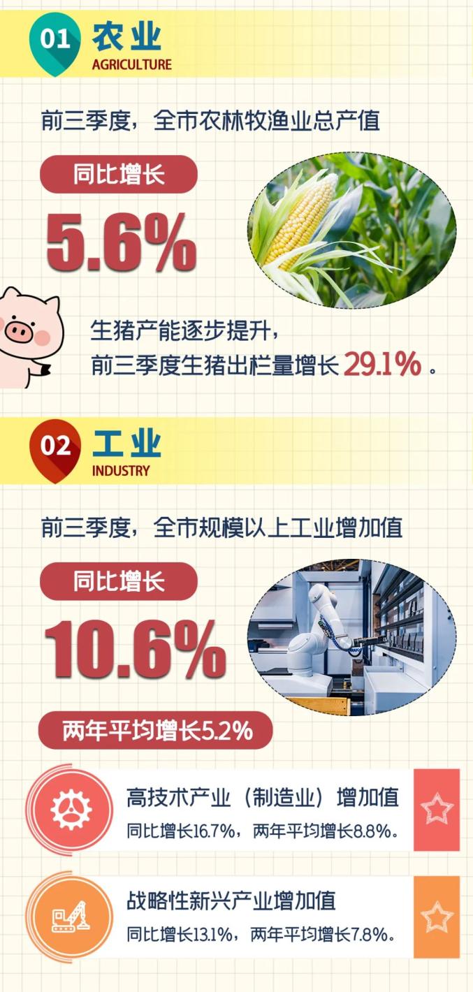 根据地区生产总值统一核算结果,前三季度我市地区生产总值为11417.55亿元,按可比价格计算,同比增长8.6%,比2019年前三季度增长8.6%,两年平均增长4.2%,两年平均增速比上半年加快0.7个百分点。其中,第一产业增加值为139.97亿元,同比增长5.2%;第二产业增加值为4024.18亿元,同比增长8.5%;第三产业增加值为7253.40亿元,同比增长8.7%。01