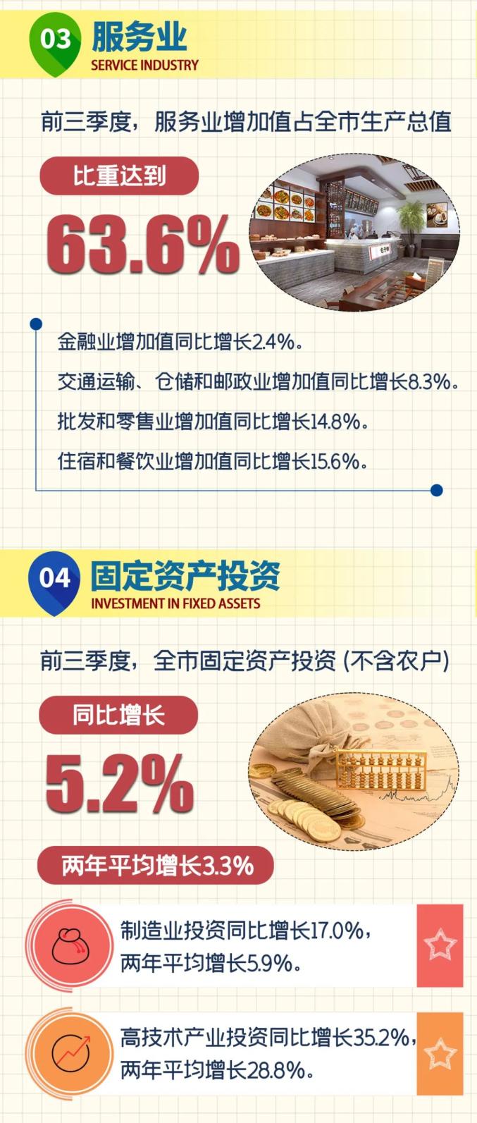 前三季度,服务业增加值占全市生产总值的比重为63.6%。其中,金融业增加值同比增长2.4%,两年平均增长3.8%;交通运输、仓储和邮政业增加值同比增长8.3%,两年平均增长2.7%;批发和零售业增加值同比增长14.8%,两年平均增长4.3%;住宿和餐饮业增加值同比增长15.6%。1-8月,规模以上服务业营业收入同比增长27.1%,两年平均增长5.9%,其中科学研究和技术服务业同比增长22.1%,租赁和商务服务业增长19.7%,信息传输、软件和信息技术服务业增长16.1%。