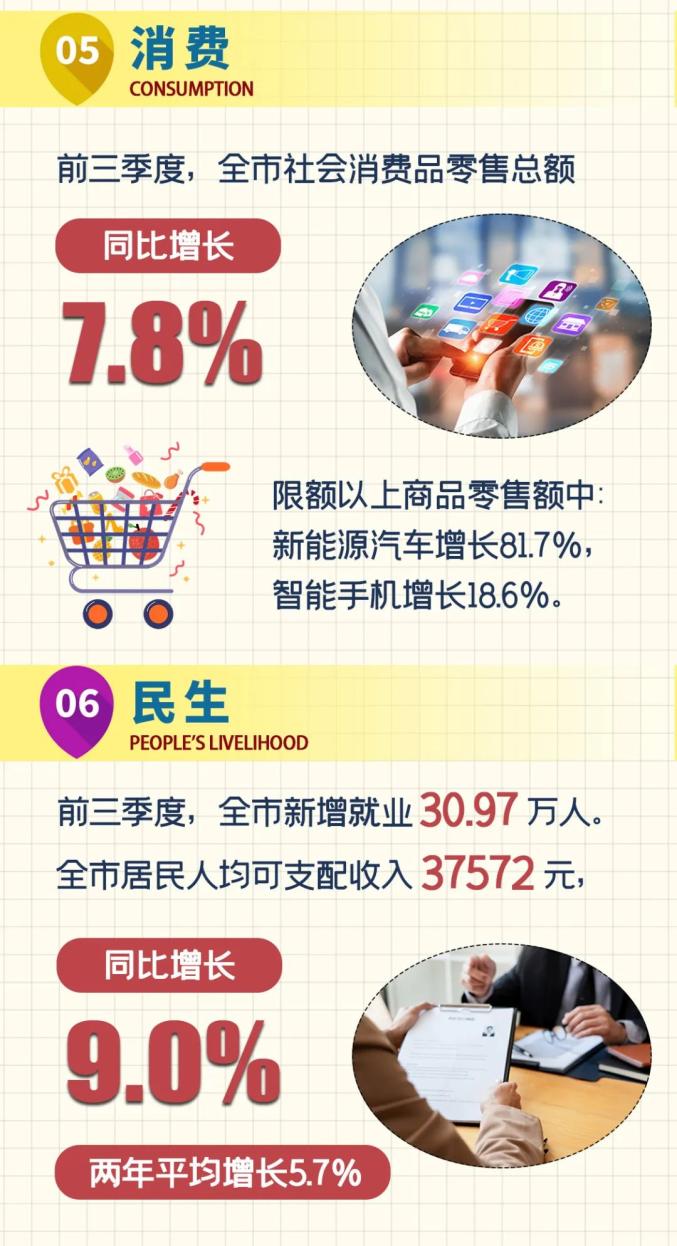 前三季度,全市新增就业30.97万人。全市居民人均可支配收入37572元,同比增长9.0%,两年平均增长5.7%,比上半年加快1.0个百分点。其中,城镇居民人均可支配收入41009元,同比增长8.7%;农村居民人均可支配收入21136元,同比增长10.7%。全市居民人均消费支出24387元,同比增长16.9%。