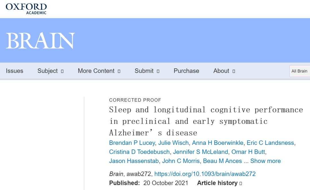Brendan P Lucey, Julie Wisch, Anna H Boerwinkle, Eric C Landsness, Cristina D Toedebusch, Jennifer S McLeland, Omar H Butt, Jason Hassenstab, John C Morris, Beau M Ances, David M Holtzman, Sleep and longitudinal cognitive performance in preclinical and early symptomatic Alzheimer’s disease, Brain, 2021;, awab272, https://doi.org/10.1093/brain/awab272