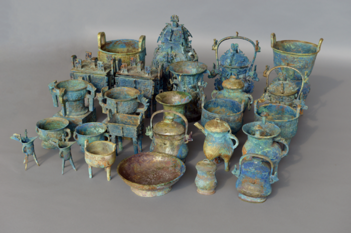 出土青铜器、陶器、漆器、木器、玉器等质地文物上千件,其中鼎、簋、簠、鬲、盘、匜等青铜器物近百件,出土带铭文青铜器三十余件,铭文上有“噩侯”、“噩伯”、“噩叔”、“噩姜”、“养伯”、“上鄀太子平侯”等。判断这是一处西周晚期到春秋早期噩国公室墓地。