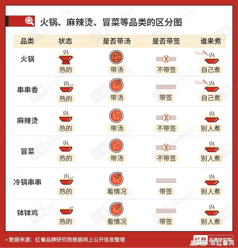 观察君根据网上信息整理出了麻辣烫、火锅、冒菜等的区分图,这张图分别从是否带汤、是否带签、烹饪方式给它们做了区分。
