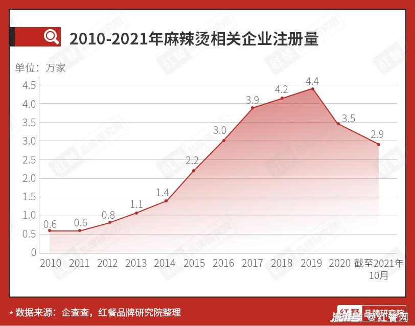 企查查数据显示,截至2021年10月,全国麻辣烫相关企业(存续状态)共有17.4万家,今年新企业注册量为2.9万家,相比前几年明显放缓。从以下图表中能看出,2018年-2019年间,麻辣烫相关企业注册量连续两年突破4万家,年注册量十年涨了7倍。2020年开始进入平稳期,整个品类热度开始逐渐降温。