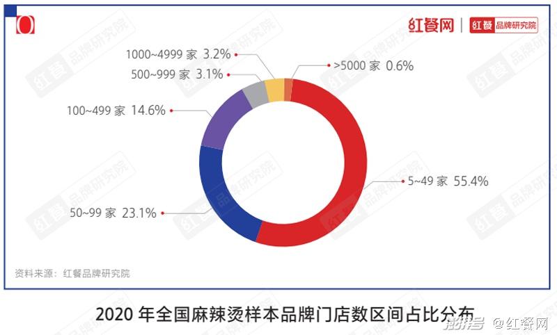 毫无疑问,“杨张”占据麻辣烫品类的绝对优势,形成双雄争霸的格局。品牌门店高度集中背后也有这样一个事实:麻辣烫市场规模已突破千亿,但连锁化率并不高。《中国餐饮品类与品牌发展报告2021》数据表明,2020年,门店数在5-49家的品牌占比为55.4%,而门店数在500家以上的品牌占比仅有6.9%。