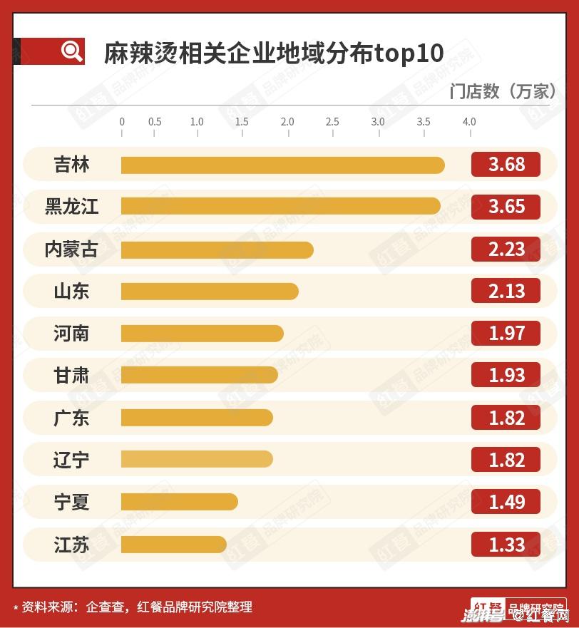 从上述top20榜单里也能看出,发源地一栏中,哈尔滨出现的频率最高,杨国福、张亮自不必说,还有发家于吉林长春的川天椒麻辣烫,来自黑龙江的马玉涛麻辣烫,还有来自哈尔滨的汤火功夫麻辣烫、秀海福麻辣烫、鑫龙福麻辣烫等。除了东北三省,内蒙古的麻辣烫增长也很出人意料。去年(截至2020年8月11日)相关企业的数量是0.8万家,今年冲到2.23万家,相当于一年时间新增了1.43万家麻辣烫相关企业,增长率为178%。去年没有登上区域分布top10榜单,今年一下子跻身前三。与此同时,安徽以1.2万家的数量跌出前十。