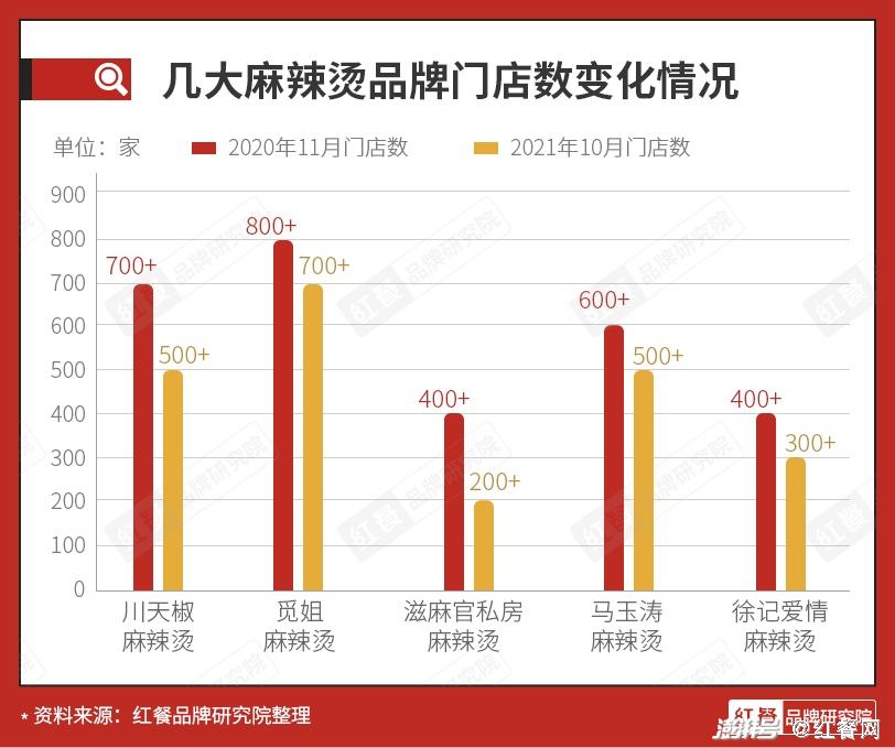 观察君在整理麻辣烫门店规模top20榜单时,也发现了这个现象,红餐品牌研究院数据表明,这20个品牌几乎一半以上门店数量相比一年前有所减少。比如川天椒麻辣烫,一年前2020年11月是700+家门店,如今只有500+家;觅姐,一年前是800+家,如今是700+家;滋麻官,一年前是400+家,如今是200+家。