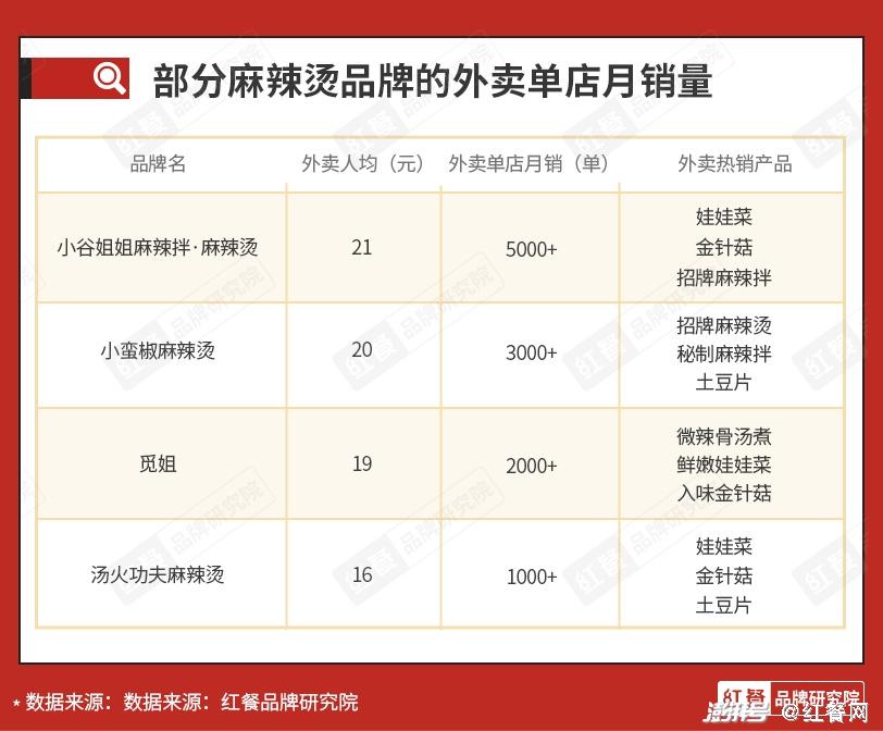 观察君梳理了麻辣烫外卖订单量较高的一些代表品牌,如下图,能看出外卖人均均比堂食低几块钱,娃娃菜、金针菇是麻辣烫外卖的热销菜品。