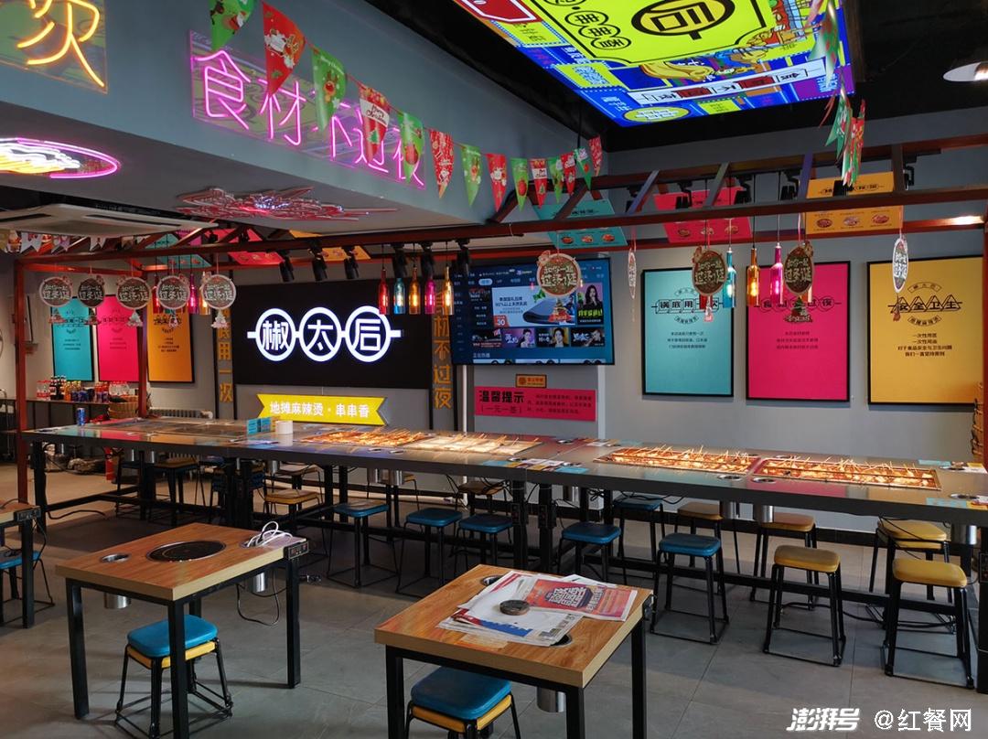 除了口味回归,观察君发现,在麻辣烫经营模式上,有的品牌也回归到最早的“地摊大锅炖串串”,比如北京的椒太后,将传统的路边摊搬到了商场,把串好食材的串串放入特制的一格一格的大锅中提前烫煮,顾客落座即可挑选食材开吃。虽然门店面积不大,只有三四十平,但大众点评显示,人均高达37+元,其目前在北京有10家门店。