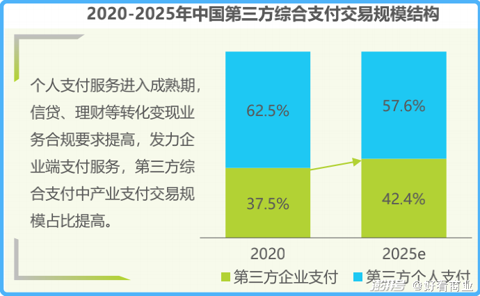 艾瑞预计,产业支付的交易规模将在第三方综合支付中占比进一步提升,或从2020年的37.5%提升到2025年的42.4%。