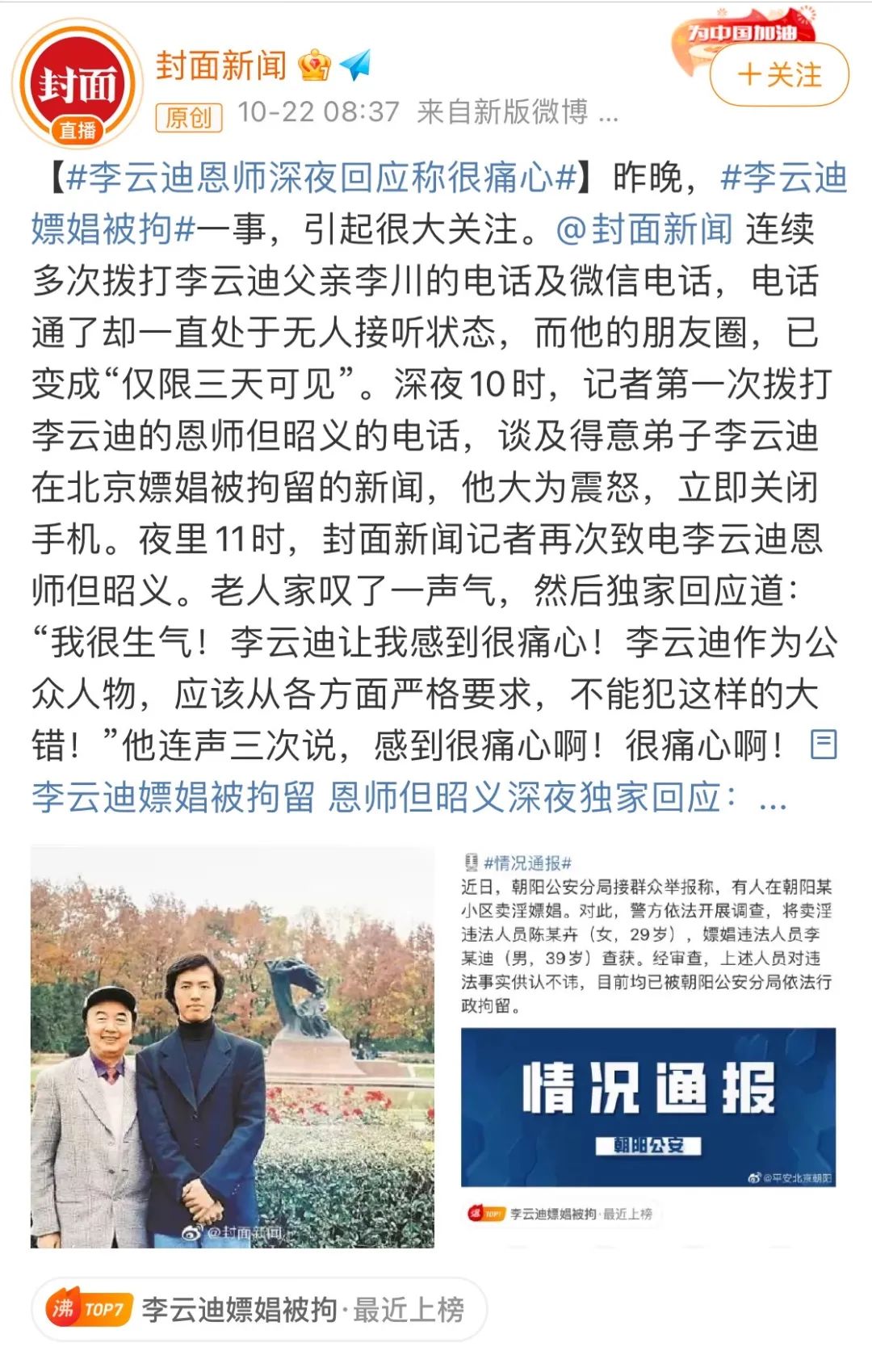 据封面新闻报道,但昭义在10月21日深夜11点回复,对李云迪感到很痛心。