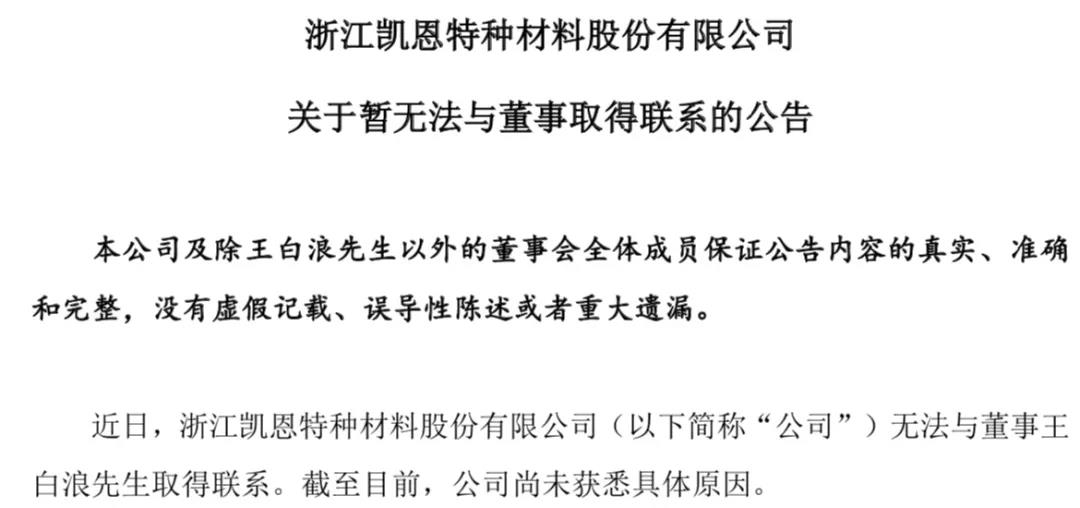 10月21日晚间,凯恩股份公告,近日已无法与董事王白浪取得联系。受此消息影响,截至10月22日收盘,凯恩股份报5.25元/股,跌幅6.42%,总市值24.55亿元。