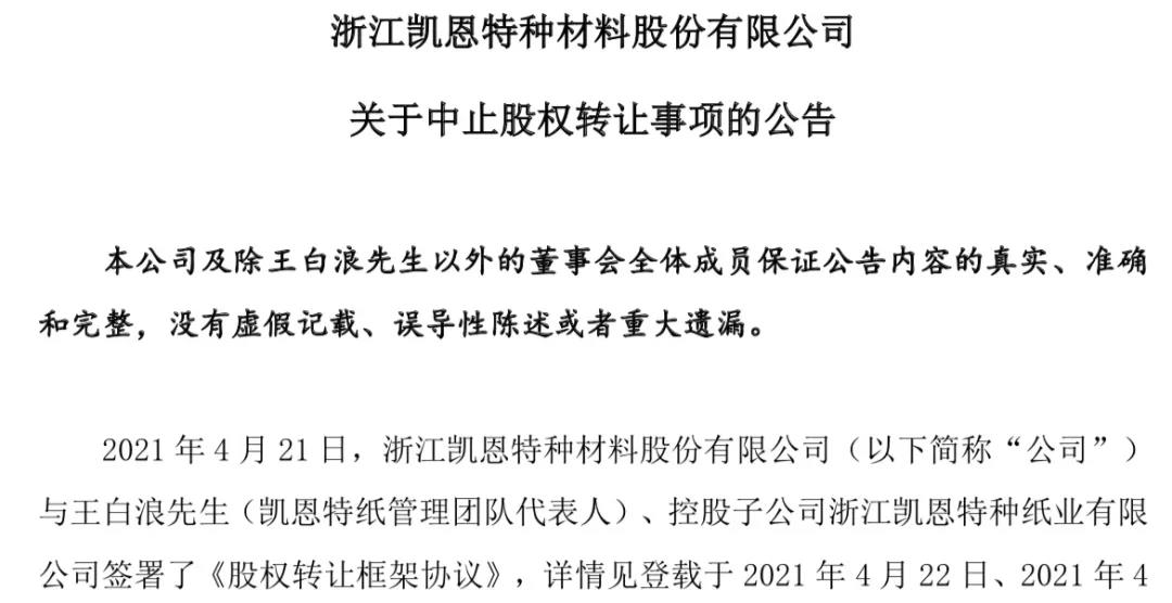 2021年4月21日,凯恩股份与王白浪、控股子公司浙江凯恩特种纸业有限公司(下称“凯恩特纸”)签署《股权转让框架协议》,公司拟将工业配套用纸相关的资产及负债整体划转至全资子公司浙江凯恩新材料有限公司,将所持凯恩特纸47.20%的股权转让给王白浪,同时将所持凯恩新材60%股权等子公司股权转让给凯恩特纸。