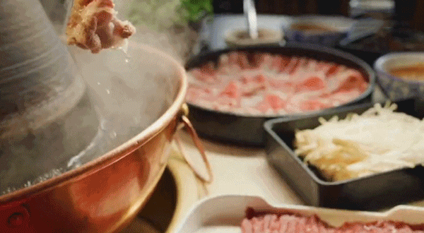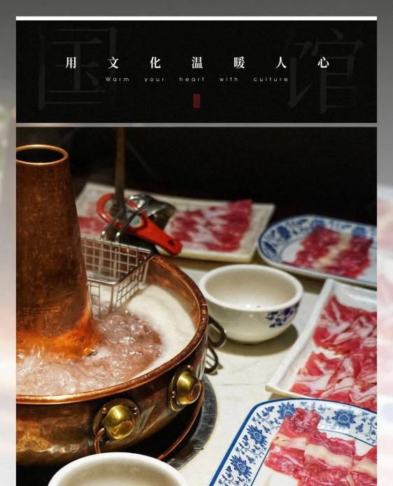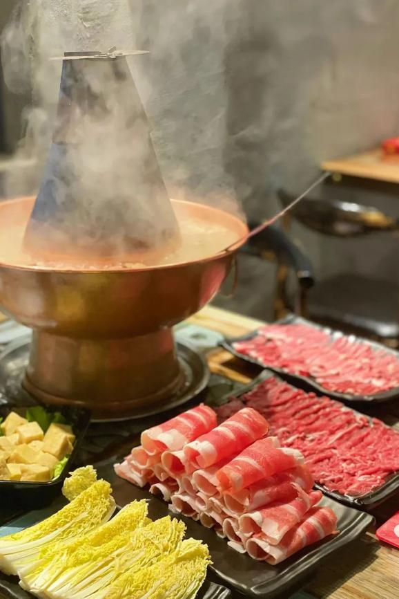 金黄色的铜炉中,飘荡着几片姜、几根葱、几粒枣。羊肉被切成轻盈的薄片,红白相间,纹理清晰,被均匀地摆在盘中,煞是好看。