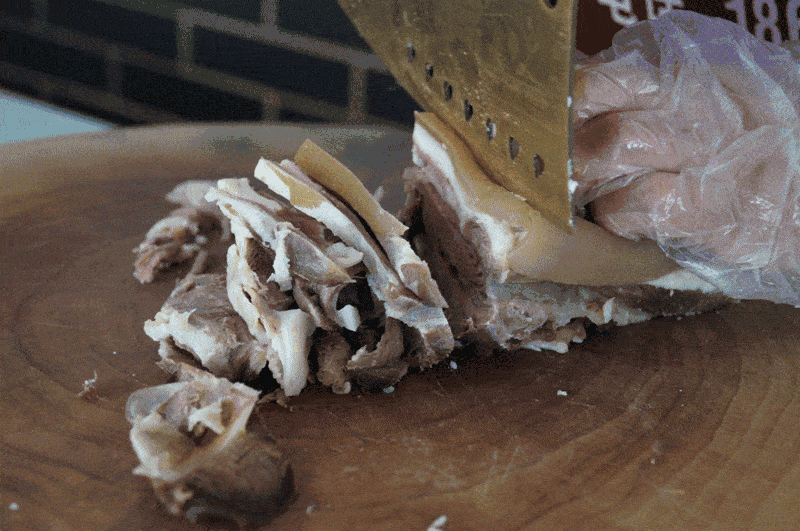 高温烘烤之后,油脂的香气被激发到了极致。拿起小刀一割,第一层味道,是皮的焦脆异香,第二层味道,是肉的鲜嫩爆汁,第三层味道,蘸上调味料,唇齿生香,久久难忘。