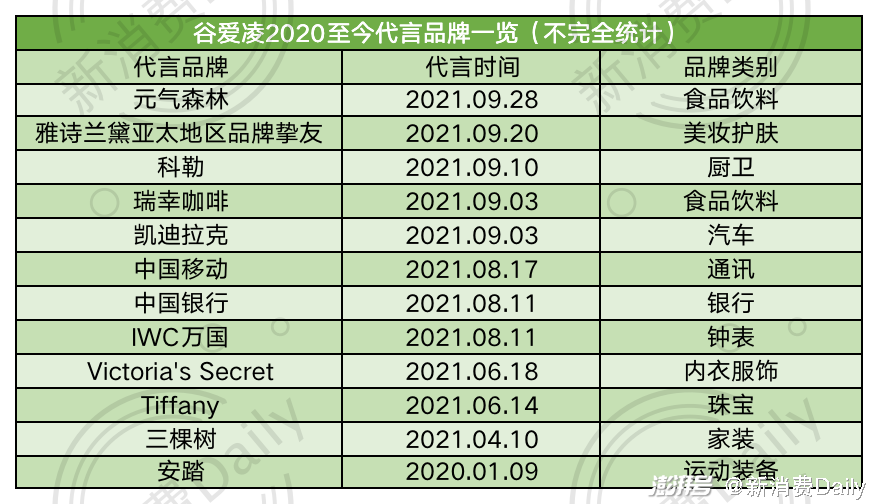 对于消费市场来说,更加吸睛的现象是,一个名叫谷爱凌的年轻滑雪运动员频繁出现,疯狂收割代言。据新消费Daily不完全统计,截至发稿前,谷爱凌在2021年,成为了11个新品牌的代言人,8、9两个月,更是一举拿下包括凯迪拉克、中国银行、元气森林等在内的8个代言品牌。