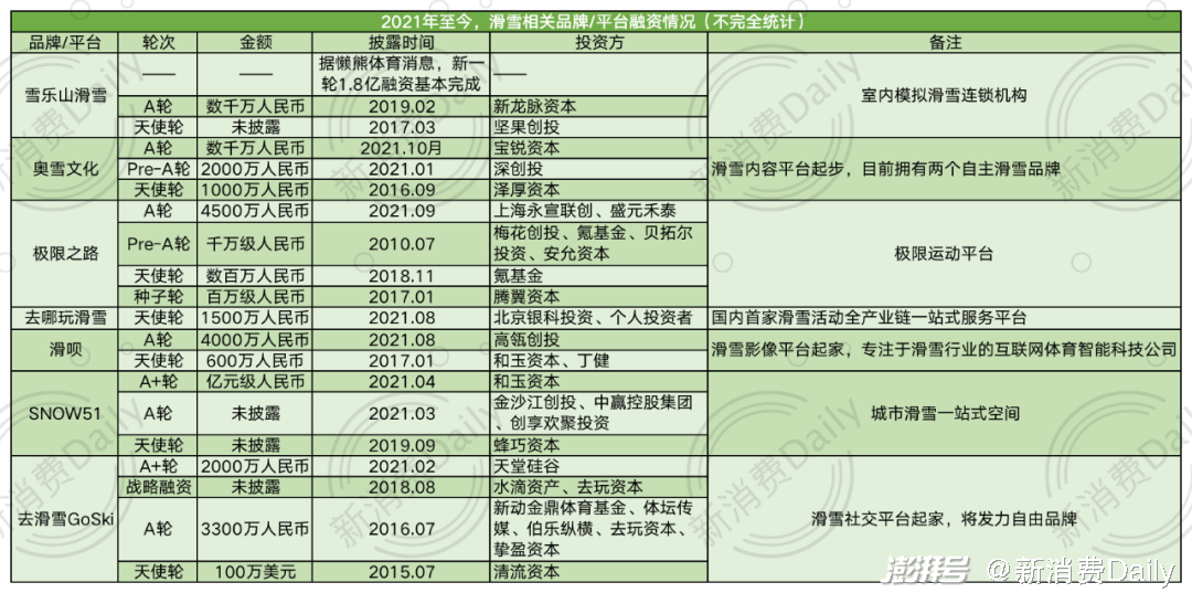 一个实打实的现象是,最近与滑雪有关的一切,开始接连得到投资人的关注与青睐。在“网红”消费品有些遇冷的这两个月,冰雪项目炙手可热。据新消费Daily不完全统计,2021至今,共有7个相关项目获得资本加持。
