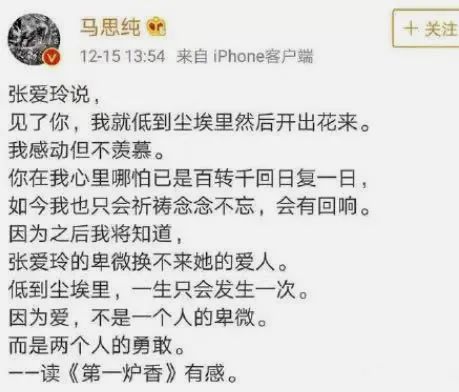 电影开拍之际,她发了一条读《第一炉香》有感的微博: