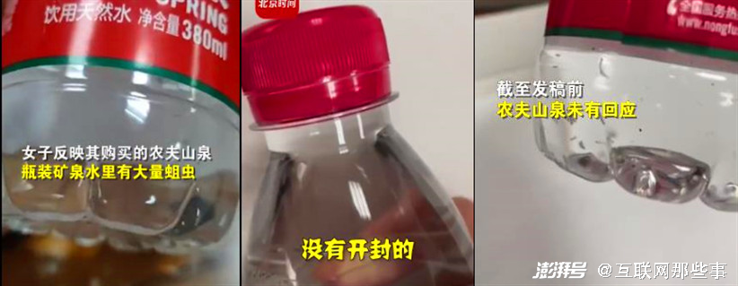 调侃完毕,言归正传,据北京时间报道,湖北武汉有女子反映,她购买的农夫山泉矿泉水里有大量蛆虫,并且是在瓶盖未开封的情况下,而且还发现的,不止一瓶有虫卵,并还录了相关的视频。