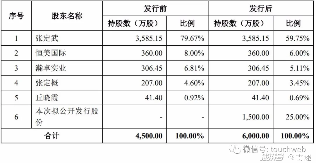 IPO后,张定武持股为59.75%,恒美国际持股为6%,瀚卓实业持股为5.11%,张定概持股为3.45%。