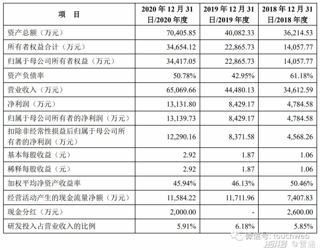 鸿富瀚2018年、2019年、2020年营收分别为3.46亿元、4.45亿元、6.5亿元;净利润分别为4784.58万元、8429万元、1.3亿元。