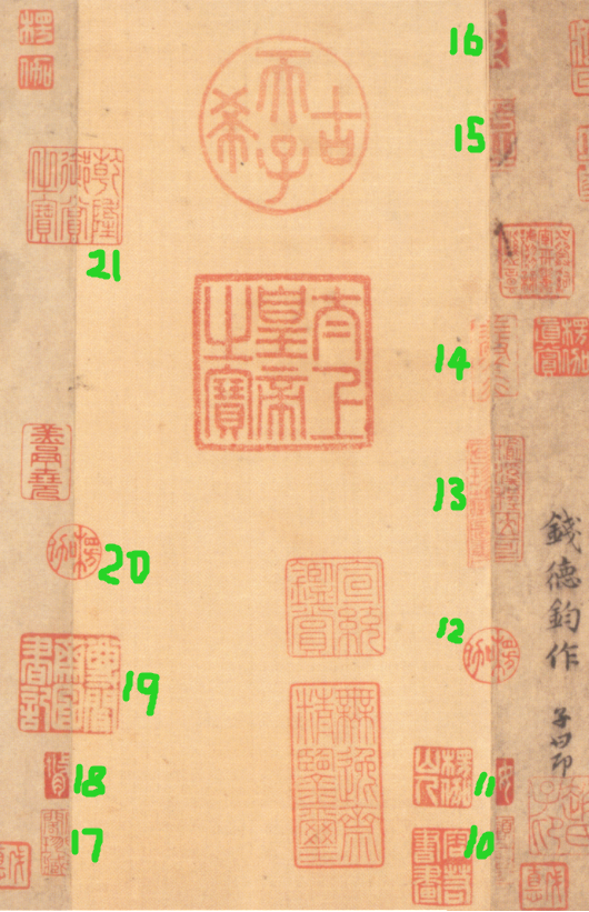 今卷自赵孟頫至徐关,据魏本成、纳兰性德所钤压缝章,包括赵孟頫与邓楀间所补嵌之小纸条,至少分作二十二纸(现存钱以道题诗为独立一纸,其前未钤压缝章)。可见经过四百数十年,到乾隆时期,有过多次的揭裱重装:或改换次序重新拼接;或抽出独立成卷,或移花接木到他卷,此盖古代书画长卷流传过程之常态也。